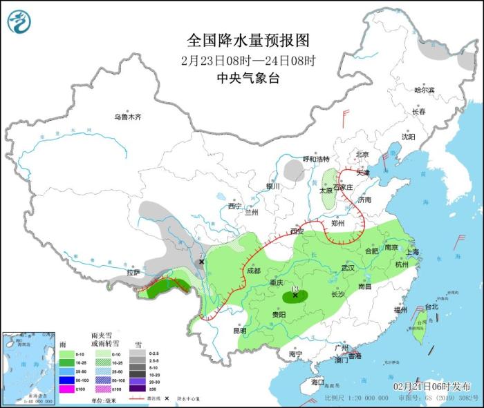 2月23日08時至24日08時,西藏東部、青海南部、山西東部、黑龍江北部等地部分地區(qū)有小到中雪或雨夾雪,西藏東部等地局地有大雪。西南地區(qū)東部、江南西部和北部、江漢、江淮等地部分地區(qū)有小雨。內蒙古中部等地部分地區(qū)有4~5級風。