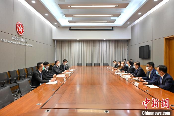 2月21日,香港特區(qū)政務(wù)司司長(zhǎng)陳國(guó)基(左三)與天津市副市長(zhǎng)朱鵬(右四)會(huì)面。 香港特區(qū)政府新聞處 攝