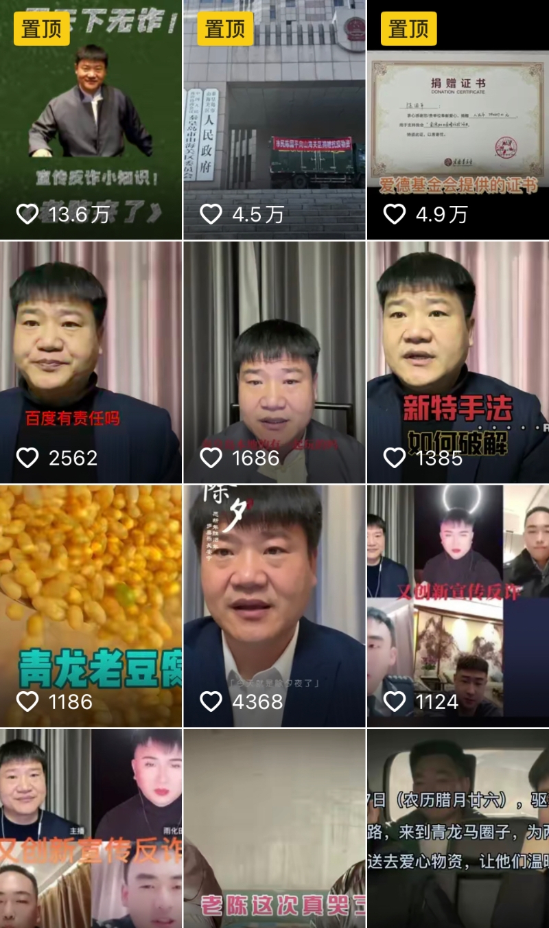 短視頻平臺(tái)上,老陳的賬號(hào)已更名為“熱心老陳”,直播動(dòng)態(tài)顯示,他今年已直播40余場。他的短視頻也一直更新,不少是關(guān)于反詐的。不同的是,他會(huì)定期公布自己的直播收入,以及做公益的進(jìn)度等。