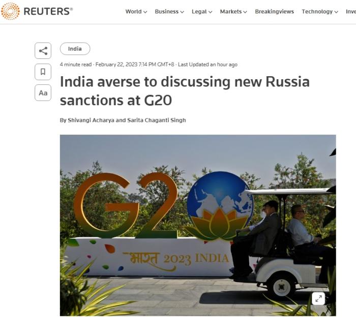 中新網(wǎng)2月22日電 據(jù)路透社22日援引印度政府高級官員消息稱,印度不希望在其擔任G20輪值主席國的一年里,討論對俄實施額外制裁的問題。