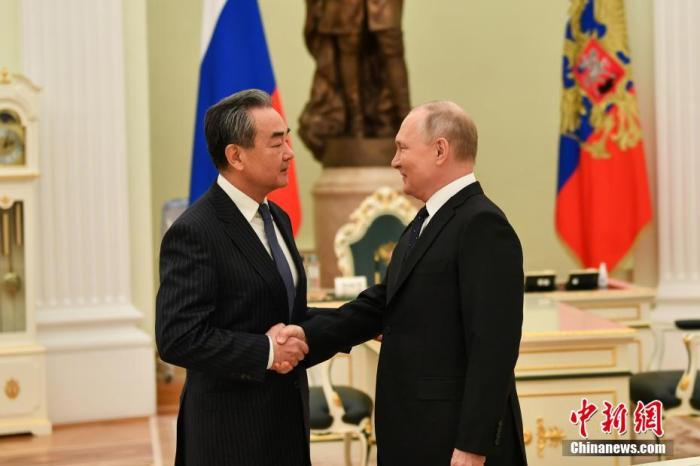 當(dāng)?shù)貢r(shí)間2月22日,俄羅斯總統(tǒng)普京在莫斯科會(huì)見中共中央政治局委員、中央外事工作委員會(huì)辦公室主任王毅。 中新社發(fā) 中國(guó)外交部供圖