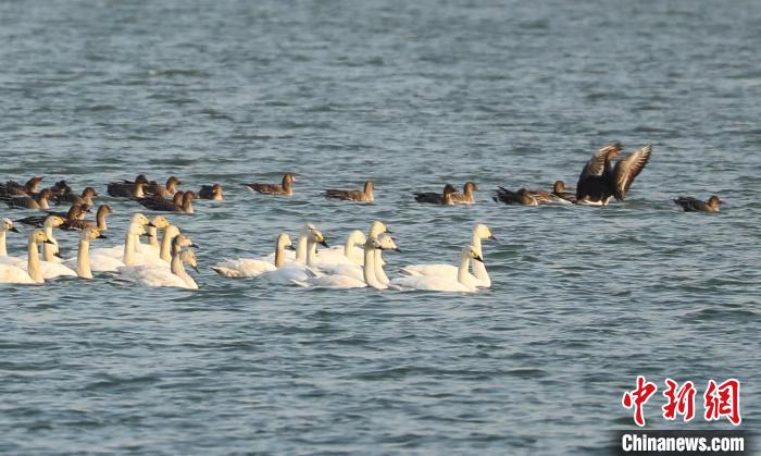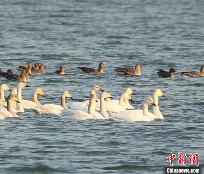 小天鵝與雁群相伴棲息在衡水湖上?!堄鄰V 攝
