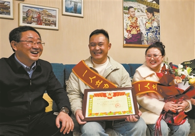 2月15日,陜西省城固縣縣委書(shū)記胡新利(左一)帶領(lǐng)軍地聯(lián)合送喜報(bào)小分隊(duì),為立功軍人家庭送喜報(bào)。軍嫂吳潔瓊(右一)收到獎(jiǎng)金和慰問(wèn)金后,全部捐贈(zèng)給城固縣紅十字會(huì),表達(dá)為家鄉(xiāng)建設(shè)作貢獻(xiàn)的心意。劉 航攝
