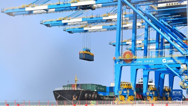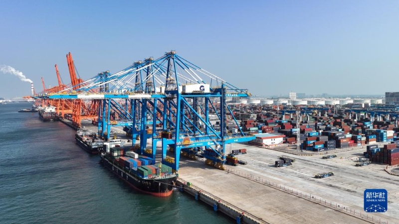 2月25日,海輪停靠廣西欽州港自動化集裝箱碼頭卸貨(無人機照片)。