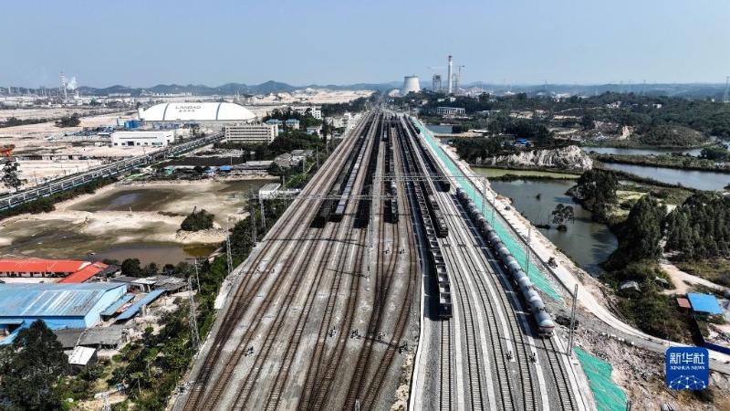 2月25日,在廣西欽州港東站,滿載貨物的鐵海聯(lián)運班列鳴笛出發(fā)。
