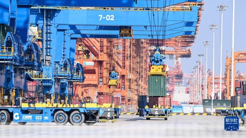 2月25日,在廣西欽州港自動化集裝箱碼頭,無人駕駛車輛在轉運集裝箱。