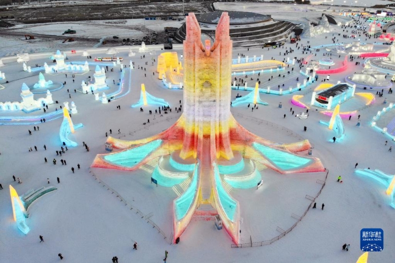 2月25日,游客在哈爾濱冰雪大世界園區(qū)游玩(無人機照片)。