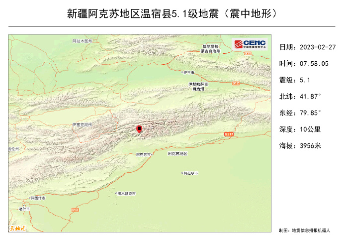 中新網(wǎng)2月27日電 據(jù)國(guó)家地震臺(tái)網(wǎng)官方微博消息,中國(guó)地震臺(tái)網(wǎng)正式測(cè)定:2月27日07時(shí)58分在新疆阿克蘇地區(qū)溫宿縣(北緯41.87度,東經(jīng)79.85度)發(fā)生5.1級(jí)地震,震源深度10千米。