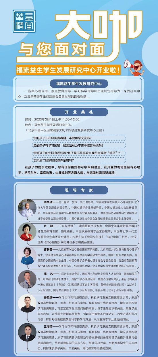 未來(lái),福流益生學(xué)生發(fā)展研究中心將大力開(kāi)展形式多樣的心理知識(shí)普及活動(dòng)、個(gè)案咨詢服務(wù)、學(xué)生學(xué)科定向及生涯發(fā)展咨詢,以促進(jìn)學(xué)生心理建設(shè)制度化、規(guī)范化、專業(yè)化,為學(xué)生的心理健康、科學(xué)學(xué)習(xí)和生涯發(fā)展提供強(qiáng)有力的保障。2023年3月1日的開(kāi)業(yè)活動(dòng)也將云集臨床心理學(xué)、家庭教育、學(xué)習(xí)科學(xué)、生涯規(guī)劃方面的6位專家,現(xiàn)場(chǎng)為市民解答學(xué)生發(fā)展方面的困惑。