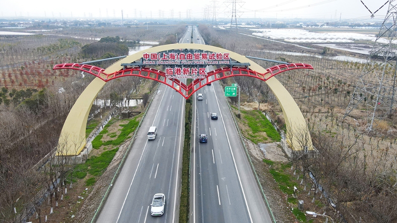 這是2022年2月10日拍攝的S2滬蘆高速上的中國(上海)自由貿(mào)易試驗(yàn)區(qū)臨港新片區(qū)“海鷗門”(無人機(jī)照片)。新華社記者 方喆 攝