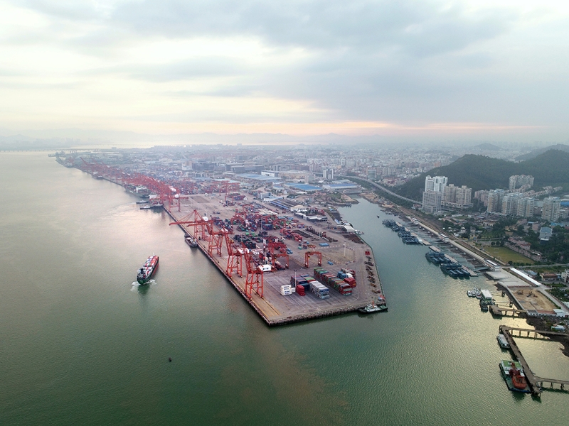 在福建自貿(mào)區(qū)廈門片區(qū)東渡港區(qū),一艘貨輪向碼頭靠攏(2017年8月26日攝,無人機(jī)照片)。新華社記者 姜克紅 攝