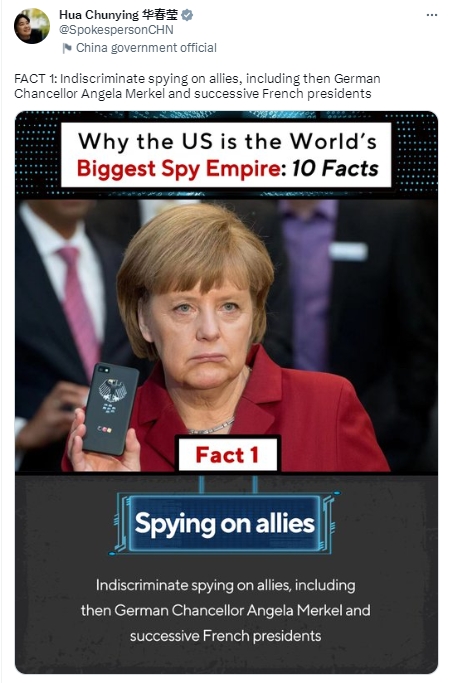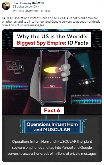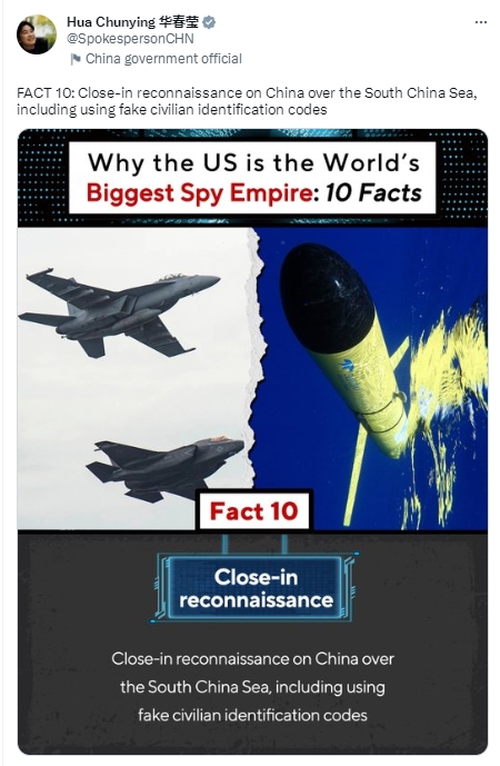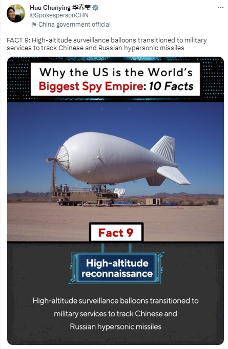 華春瑩在推特上稱,雖然美國部分人聲稱中國有一個(gè)覆蓋全球五大洲的“監(jiān)視氣球”計(jì)劃,但真相是:美國自己才是世界上最大的“監(jiān)控帝國”。她曬圖列舉了10個(gè)有關(guān)美國是“監(jiān)控帝國”的事實(shí)真相。