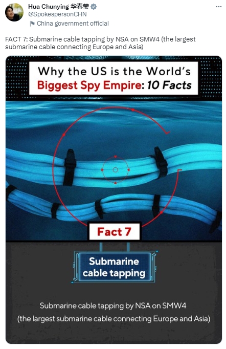 真相7:海底電纜竊密。美國國安局侵入SMW4(連接歐洲和亞洲的最大海底電纜)以竊取機(jī)密信息。