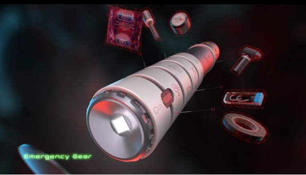 求生倉1號的頭部會配置一個指南針,尾部則內(nèi)置一個戰(zhàn)術電筒,方便在黑暗中進行觀察。根據(jù)不同的需求使用,還可以通過旋轉對應倉位去分拆對應儲物倉或者轉換求生倉1號的形態(tài),其中第二節(jié)倉位可以調(diào)節(jié)為一個高硬度的錘頭用于應急防御和擊打求生。