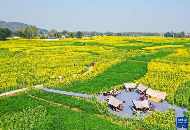 近日,位于四川成都崇州市的數(shù)萬(wàn)畝油菜花競(jìng)相綻放,吸引游客前來(lái)踏春觀光。