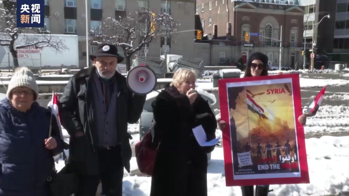 同一天,來自加拿大多地的抗議者,也在美國駐多倫多總領(lǐng)館前舉行活動,抗議美國和加拿大等國對敘利亞實施的制裁。