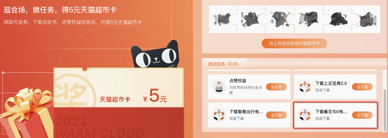 逛“溫暖上云“會(huì)場(chǎng),完成下載看見(jiàn)100電子書等任務(wù)得5元天貓超市卡
