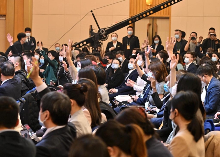 3月7日,十四屆全國人大一次會議在梅地亞中心舉行記者會,外交部長秦剛就中國外交政策和對外關(guān)系回答中外記者提問。這是記者在現(xiàn)場舉手提問。