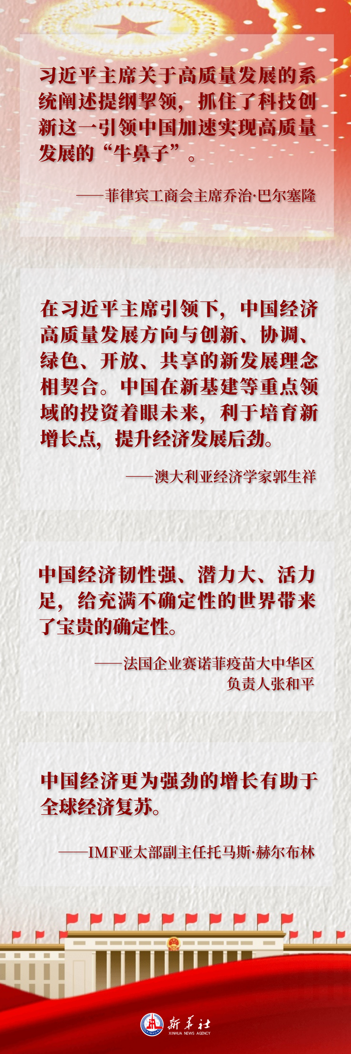 中共中央總書記、國(guó)家主席、中央軍委主席習(xí)近平5日下午在參加他所在的十四屆全國(guó)人大一次會(huì)議江蘇代表團(tuán)審議時(shí)強(qiáng)調(diào),高質(zhì)量發(fā)展是全面建設(shè)社會(huì)主義現(xiàn)代化國(guó)家的首要任務(wù)。接受采訪的外國(guó)人士對(duì)中國(guó)經(jīng)濟(jì)高質(zhì)量發(fā)展藍(lán)圖充滿期待,看好中國(guó)創(chuàng)新活力與開放紅利,倍加期待中外合作共贏。