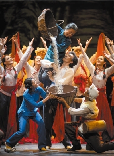 延安木刻版畫是中國美術的瑰寶。該劇用舞蹈語匯呈現(xiàn)《來了親人八路軍》《當敵人搜山的時候》《豆選》等黑白版畫作品,將版畫硬朗堅挺的線條筆觸與民間舞的氣韻風格相結合,通過動態(tài)舞姿讓版畫“流動”起來。不少劇情來源于版畫,比如第一幕群舞“抗旱”,便是對古元創(chuàng)作于1943年的版畫《抗旱》的動人再現(xiàn)。