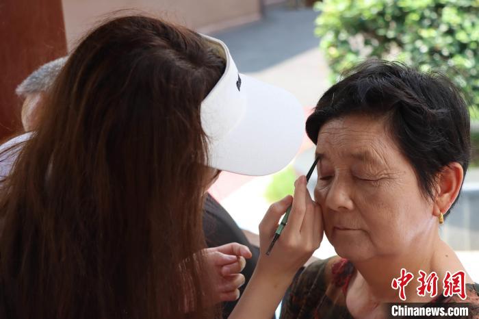 圖為“圓夢計劃”化妝組成員為老人化妝 “圓夢計劃”公益實踐團隊供圖