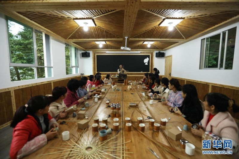 2020年11月5日,在貴州省赤水市大同鎮(zhèn)竹編非遺產(chǎn)學研基地,楊昌芹(中)在指導(dǎo)學員學習竹編。新華社發(fā)(王長育 攝)