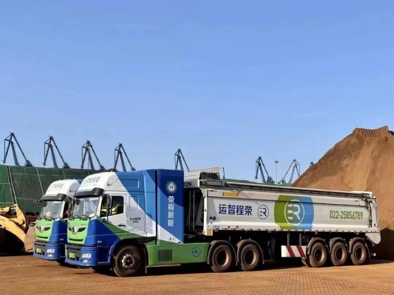榮程集團(tuán)氫能重卡在天津港碼頭裝卸礦粉。(受訪者供圖)