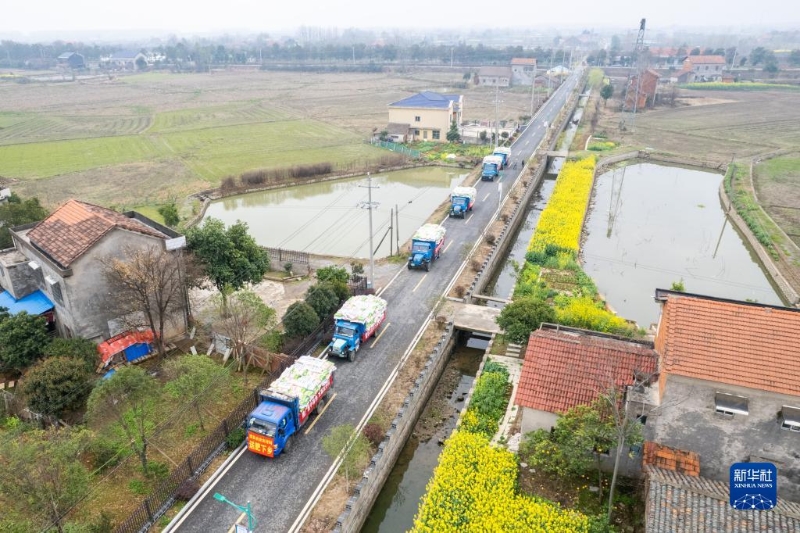 3月8日,送肥下鄉(xiāng)的車隊(duì)行駛在湖南省常德市澧縣夢(mèng)溪鎮(zhèn)的道路上(無(wú)人機(jī)照片)。