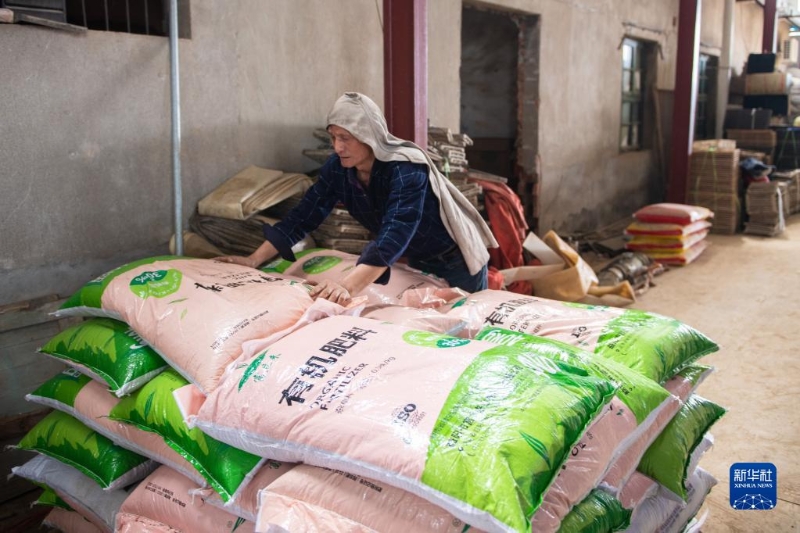 3月7日,在湖南省益陽(yáng)市桃江縣灰山港鎮(zhèn)一肥料車間,工作人員在打包運(yùn)往澧縣的有機(jī)肥料。