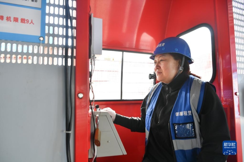 3月8日,在陜西省西安市未央?yún)^(qū)一處建筑工地,中建三局西北公司電梯司機劉會瓊在施工現(xiàn)場工作。