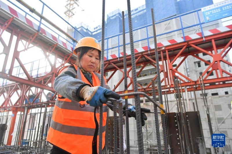 3月8日,在陜西省西安市未央?yún)^(qū)一處建筑工地,中建三局西北公司鋼筋工李華秀在施工現(xiàn)場工作。