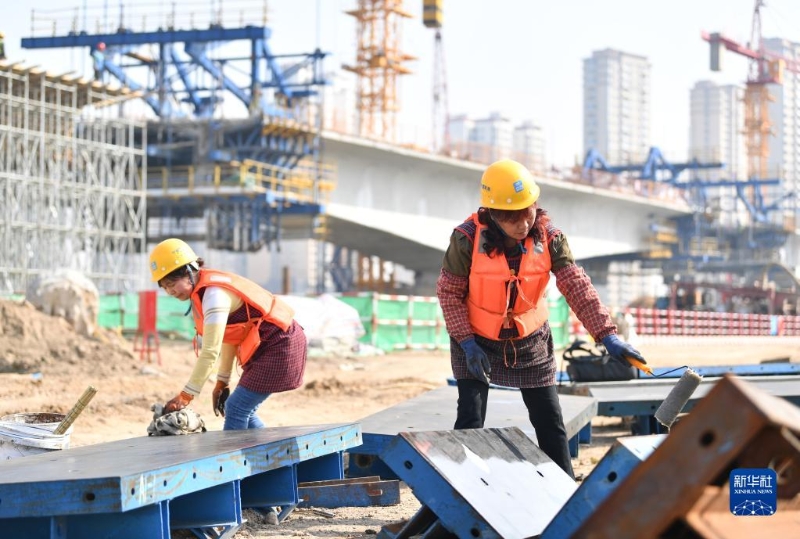 3月8日,在位于陜西省西安市國際港務區(qū)的水流路跨灞河大橋項目施工現(xiàn)場,中建三局西北公司模板工趙菊華(左)、汪仕英在施工現(xiàn)場工作。