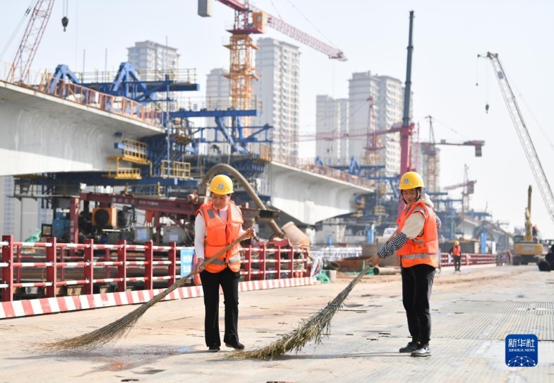 3月8日,在位于陜西省西安市國際港務區(qū)的水流路跨灞河大橋項目施工現(xiàn)場,中建三局西北公司工人田小葉(左)、劉雪琴在施工現(xiàn)場工作。