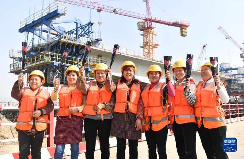 3月8日,在位于陜西省西安市國際港務區(qū)的水流路跨灞河大橋項目施工現(xiàn)場,中建三局西北公司女工友展示承建單位贈送的鮮花。
