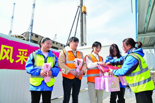 昨天,中建三局上海嗶哩嗶哩新世代產(chǎn)業(yè)園項目部工地的女工領(lǐng)取節(jié)日慰問品。新華社 圖