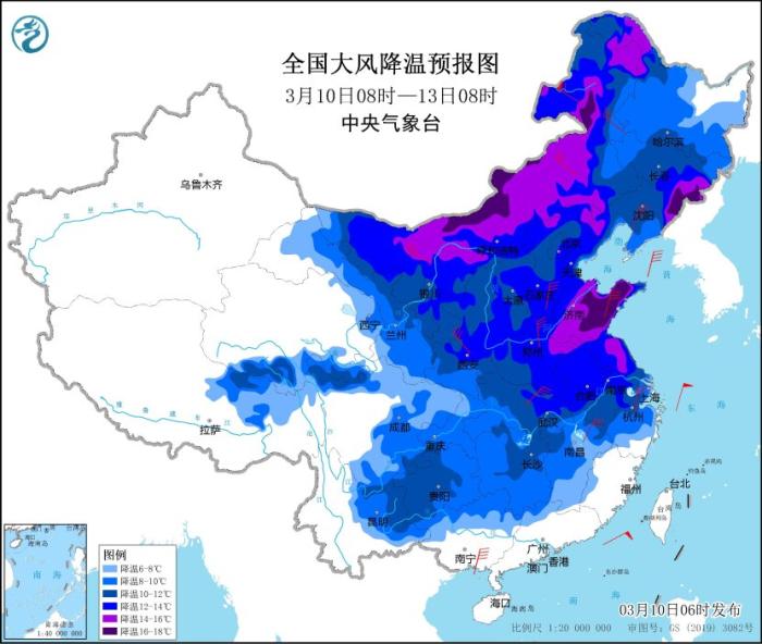 受寒潮影響,預計,3月10日08時至3月13日08時,中東部大部地區(qū)氣溫下降6~10℃,內(nèi)蒙古、華北、黃淮、江淮東部等地氣溫下降12℃,局部超過16℃,上述地區(qū)先后有4~6級風,陣風7~9級,部分地區(qū)并伴有沙塵天氣。我國近海大部海域有6~8級風,陣風9~11級。過程最低氣溫出現(xiàn)在13日早上,最低氣溫0℃線將位于陜西南部、河南西部、河北南部到天津一線,山東東部和江蘇東北部最低氣溫也將達到0℃左右。