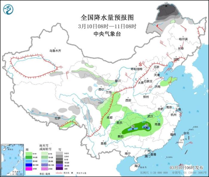 3月10日08時至11日08時,內(nèi)蒙古東北部、黑龍江西北部、西藏東部和南部、青海東部、甘肅河西地區(qū)、川西高原北部等地部分地區(qū)有小到中雪或雨夾雪,其中,內(nèi)蒙古東北部、黑龍江西北部等地部分地區(qū)有大到暴雪(10~17毫米)。西藏東南部、甘肅南部、四川西部和北部、重慶、貴州、湖北南部、湖南中北部、江西中西部、山東半島等地部分地區(qū)有小到中雨,局地有大雨(25~40毫米)。內(nèi)蒙古中東部、東北地區(qū)西部、華北、山東半島等地部分地區(qū)有4~6級風,其中,內(nèi)蒙古東北部等地部分地區(qū)有7~8級風(見圖6)。
