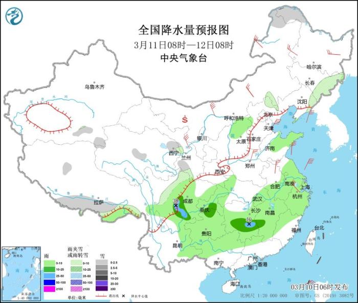 圖6 全國降水量預報圖(3月10日08時-11日08時)