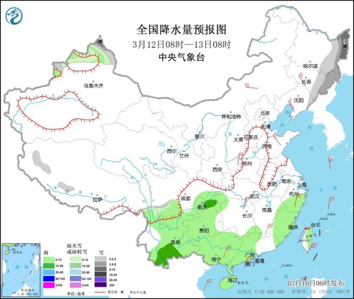 3月11日08時至12日08時,西藏南部、青海東部、甘肅南部、川西高原北部、內(nèi)蒙古東北部、黑龍江西北部、吉林東部、遼寧東部等地的部分地區(qū)有小雪或雨夾雪。西藏東南部、山西北部、山東中東部、西南地區(qū)東部、江南、江淮、華南北部等地的部分地區(qū)有小到中雨,局地有大雨(25~40毫米)。內(nèi)蒙古中東部、東北、華北、黃淮、江淮等地的部分地區(qū)有4~6級風。(見圖7)。