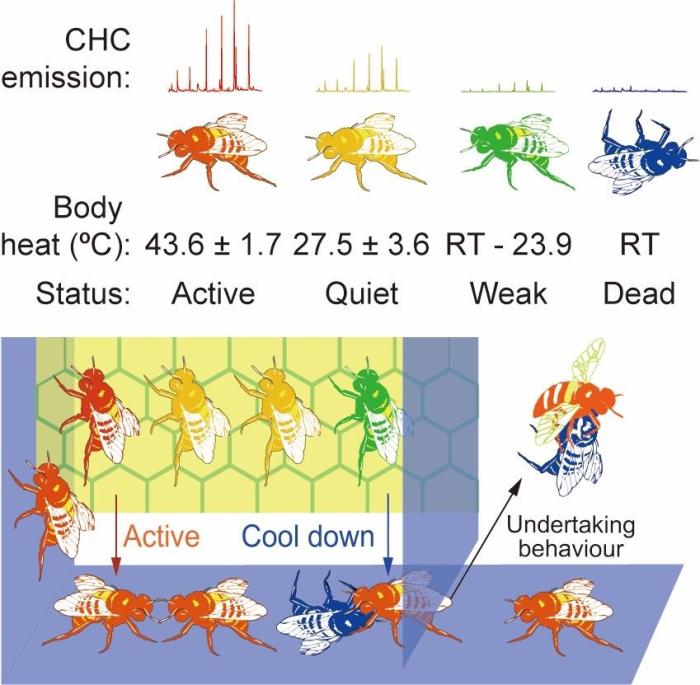 研究最終證明,體溫變化引起的蜜蜂蠟質(zhì)表皮烴揮發(fā)散發(fā)量差異,是引起蜜蜂識別成年蜂死亡的主要信號,蜜蜂不必等到同伴尸體發(fā)臭才能發(fā)現(xiàn)其死亡。