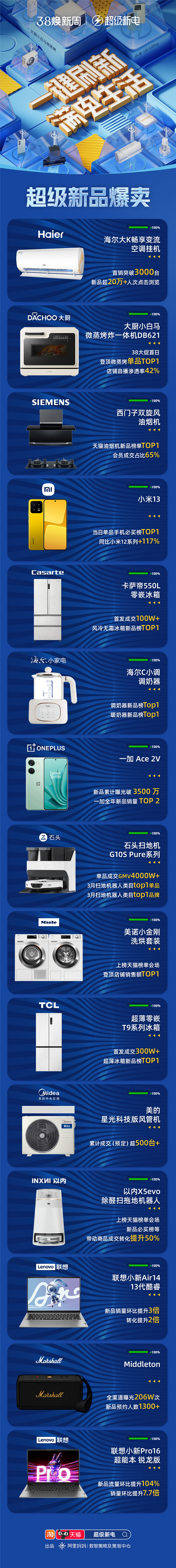 阿里媽媽是國內(nèi)最科學(xué)的營銷平臺之一,天貓是國內(nèi)最大的品牌電商平臺,二者多年在用戶數(shù)據(jù)、消費習(xí)慣、營銷經(jīng)驗等方面的積累,正在這個全新的時代爆發(fā)出更大的價值。因為影響用戶的方式、緯度、渠道等都越來越多,必須有足夠的數(shù)據(jù)洞察能力,前瞻的內(nèi)容創(chuàng)意、科學(xué)的投放策略、豐富的廣告資源等綜合性優(yōu)勢,才能形成打動用戶形成爆款的盛事。從這一點來看,阿里媽媽和天貓對于消費市場和消費者越來越深刻的理解,這一點有點像人工智能的發(fā)展,學(xué)習(xí)能力突破奇點,差距就會被指數(shù)級的拉大。而這個差距體現(xiàn)的核心領(lǐng)域,就是在新品打造成功的確定性上。在整套系統(tǒng)工程中,天貓超級新電深度結(jié)合阿里媽媽和天貓為新品構(gòu)建的數(shù)智化上新經(jīng)營方法。在新品上市期,基于達(dá)摩盤序列化聯(lián)投、貨品洞察能力與淘積木新品預(yù)約能力,幫助新品找到核心TA完成長效蓄水。在核心種草期,通過阿里媽媽廣告投放產(chǎn)品,無論是曝光渠道還是種草渠道都能實現(xiàn)全域聯(lián)投,短時間內(nèi)將新品核心人群盤活增加轉(zhuǎn)化粘性;同時將大量站外曝光種草人群回流至淘內(nèi),為下一步序列化聯(lián)投進行人群儲備。在核心爆發(fā)期利用MTA分析能力篩選出最優(yōu)廣告觸點組合,定向投放站外回流人群進行序列化觸達(dá),結(jié)合新品云發(fā)布、新品nickname搜索定制、萬相臺百萬新品智能投放等,整合淘內(nèi)流量場域完成品效提升,實現(xiàn)新品流量共振。在38超級新電項目中,品牌新品在與消費者的高頻共振中得到成交爆發(fā)。海爾大K暢享變流空調(diào)掛機,首銷突破3000臺,新品超20萬+人次點擊瀏覽 ;大廚小白馬微蒸烤炸一體機DB621,38大促首日登頂微蒸烤單品TOP1,店鋪自播滲透率42%;西門子雙旋風(fēng)油煙機,登頂天貓油煙機新品榜單TOP1,會員成交占比65%;小米13手機,單品登頂手機必買榜TOP1,同比小米12系列增長117%。