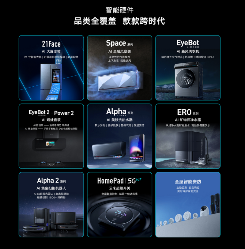 云米科技的產(chǎn)品線非常豐富,作為全屋智能這一概念的首倡者,云米科技一直在走獨特的“科技潮流感”路線,超過60+品類的黑科技家電,搭建智能客廳、智能廚房、智能臥室、智能浴室等沉浸式智能場景,全方位展示智能家居+智能家電+軟件服務為一體的一站式全屋智能解決方案。