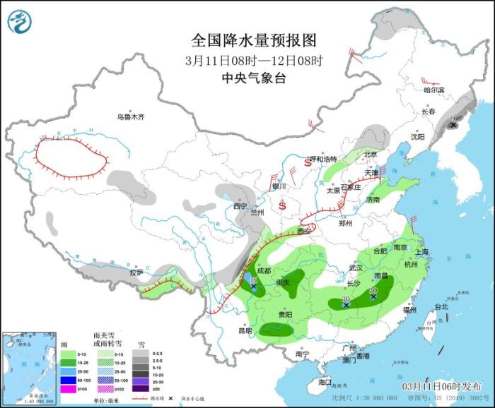 3月11日08時至12日08時,青海西部、甘肅西南部、川西高原、內(nèi)蒙古東北部、黑龍江西北部、吉林東部、西藏南部等地部分地區(qū)有小到中雪或雨夾雪,其中,吉林東部等地局地有大雪(5~9毫米)。西藏東南部、四川中東部、重慶、貴州、湖北西南部、湖南中南部、安徽中南部、江西、江蘇南部、上海、浙江、福建西北部、廣西北部和云南東部等地的部分地區(qū)有小到中雨,局地大雨(25~35毫米)。內(nèi)蒙古大部、華北、黃淮等地部分地區(qū)有4~6級風(fēng)。渤海、渤海海峽、黃海大部有7~8級、陣風(fēng)9級的大風(fēng)。