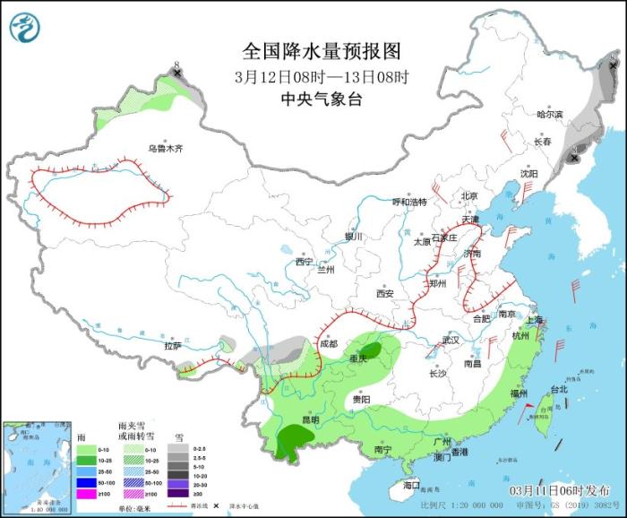 全國降水量預(yù)報圖(3月11日08時-12日08時)