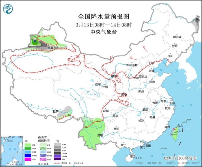 3月13日08時至14日08時,黑龍江東北部、新疆沿天山地區(qū)等地部分地區(qū)有小到中雪,局地有大到暴雪。新疆伊犁河谷、四川南部、云南中西部、臺灣島等地部分地區(qū)有小到中雨,局地有大雨(25~30毫米)。內(nèi)蒙古等地部分地區(qū)有4~6級風(fēng)。東海大部海域、臺灣海峽、南海北部和西南部海域、北部灣有7~8級、陣風(fēng)9級的大風(fēng)。