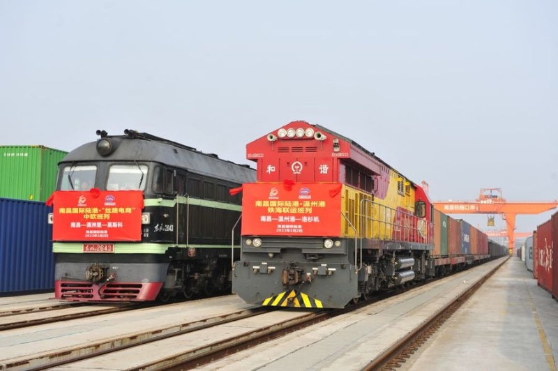 2023年3月2日,“南昌-滿洲里-莫斯科”中歐班列(左)、“南昌-溫州港-洛杉磯”鐵海聯(lián)運班列準備從南昌國際陸港鐵路口岸二期駛出。新華社記者 彭昭之 攝