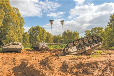照片中,兩輛以色列“梅卡瓦”Ⅲ主戰(zhàn)坦克正在進行“復(fù)雜地形條件下”作戰(zhàn)演練。不知何故,右前這輛“梅卡瓦”Ⅲ主戰(zhàn)坦克倒扣在淤泥里,動彈不得。不遠處,一輛美制M88A2“大力士”裝甲搶救車正準備對其“施以援手”。
