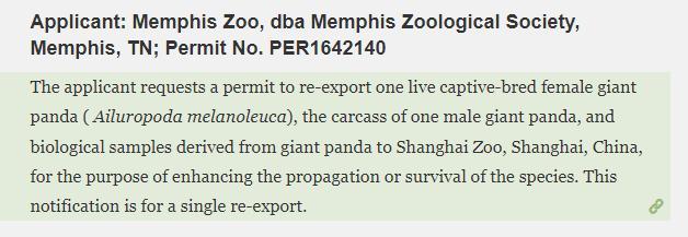 文件顯示,美國魚類及野生動物管理局(USFWS)收到了一則來自“孟菲斯動物園”的申請,許可證號碼為PER1642140。