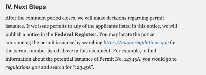 據(jù)介紹,公示期結(jié)束后,美國魚類及野生動物管理局將發(fā)放許可證,并在《聯(lián)邦公報》上發(fā)布通知。屆時,可憑借許可證號碼,登陸美國政府文件網(wǎng)站(www.regulations.gov)查詢許可通知。