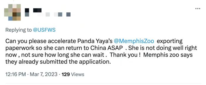 有網(wǎng)友表示:“丫丫現(xiàn)在的狀態(tài)不是很好,不知道她還能等多久。”該網(wǎng)友呼吁美國魚類與野生動物管理局盡快處理孟菲斯動物園提交的的申請,讓“丫丫”盡快回到中國。
